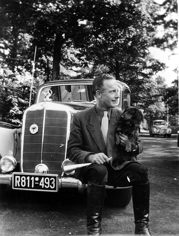 Fahrer Ferdinand präsentiert sich vor dem herrschaftlichen 220er Benz mit dem hochherrschaftlichen Dackel, Urschel vom Sentisblick.