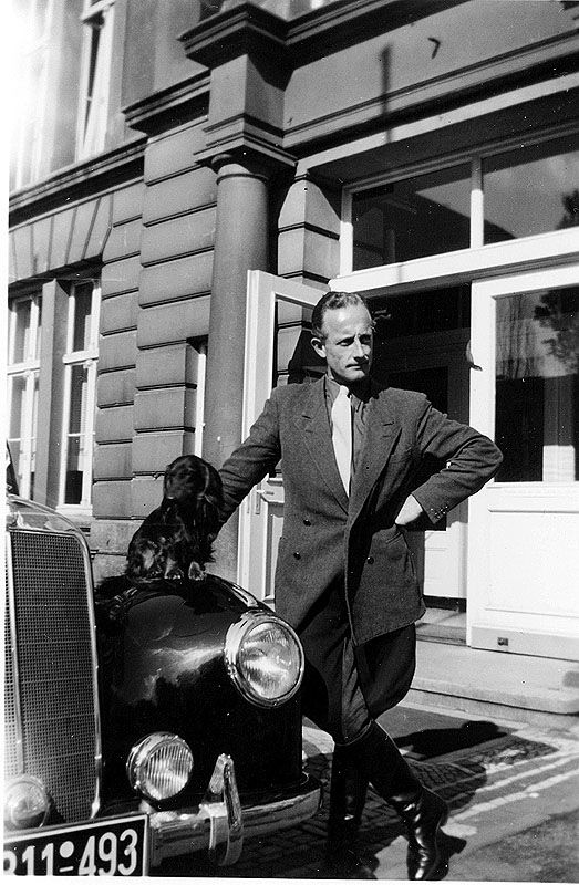 Fahrer Ferdinand präsentiert sich nochmals vor dem herrschaftlichen 220er Benz mit dem hochherrschaftlichen Dackel, Urschel vom Sentisblick.