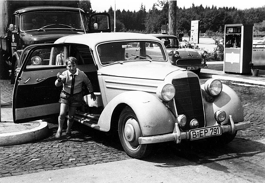 An einer Autobahn-Tankstelle muss der Benzintank dieses Berliner Mercedes Benz 170 aufgefüllt werden.