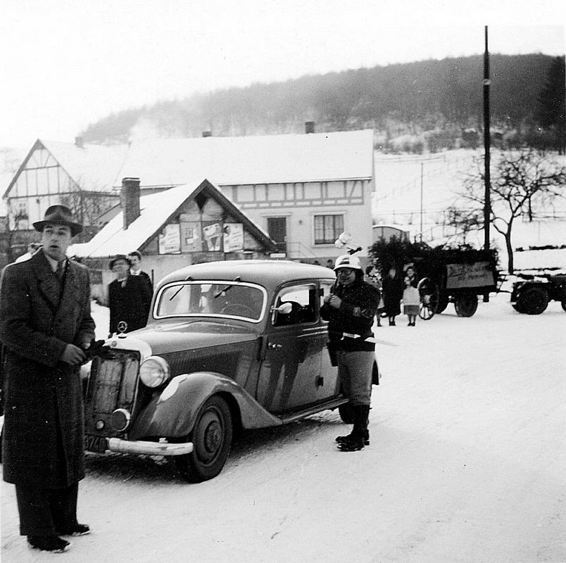Dieser Benz 170 ist wohl als Begleitfahrzeug an einem Festumzug beteiligt.