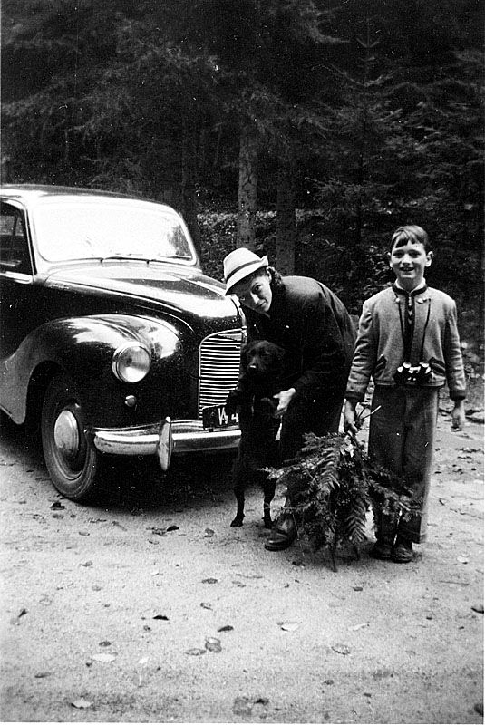 Mutter, Kind und Hund sind nach einem Waldspaziergang zu ihrem Austin A40 Devon (1947-52) zurückgekommen.