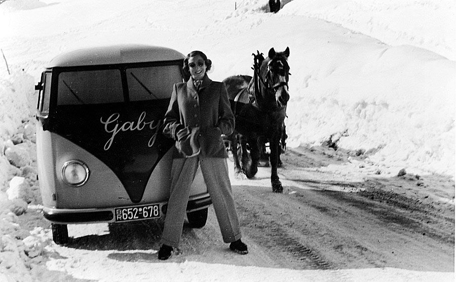 Die hübsche Gaby von Gaby-Moden posiert vor ihrem Firmenwagen VW Transporter T1.
