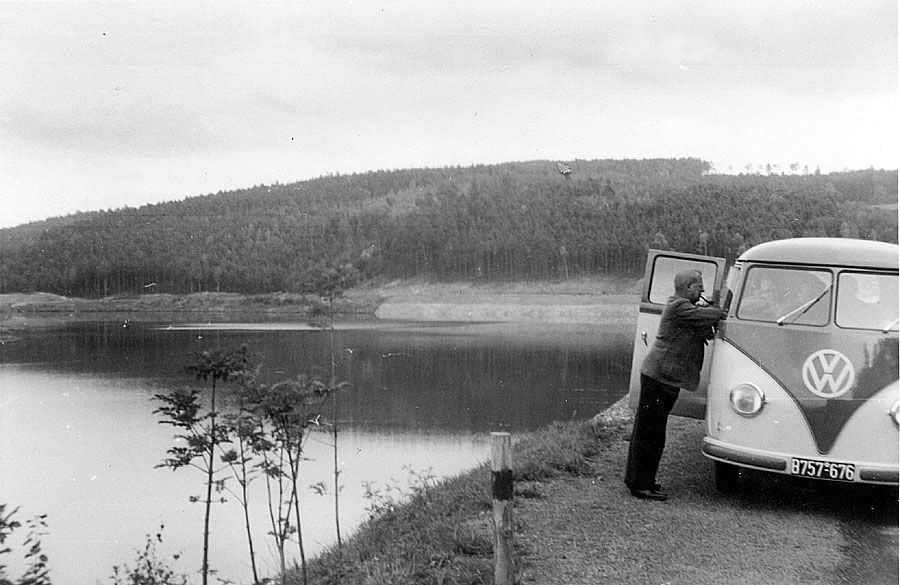 Die kleine Reisegruppe macht mit ihrem T1 VW-Bus Rast an einem Stausee.
