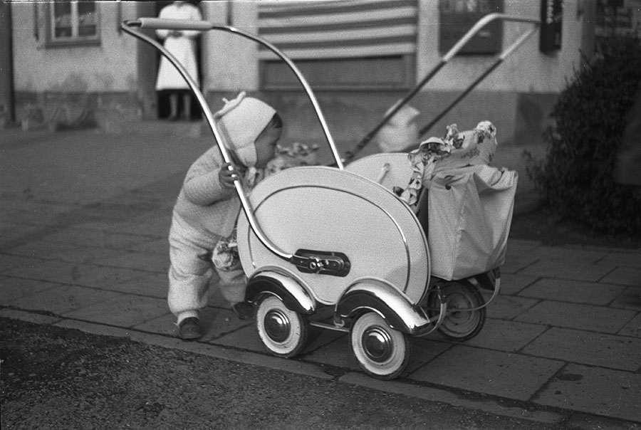 Dieser Erdling schiebt 1955 seinen verchromten Sportwagen vor sich her.