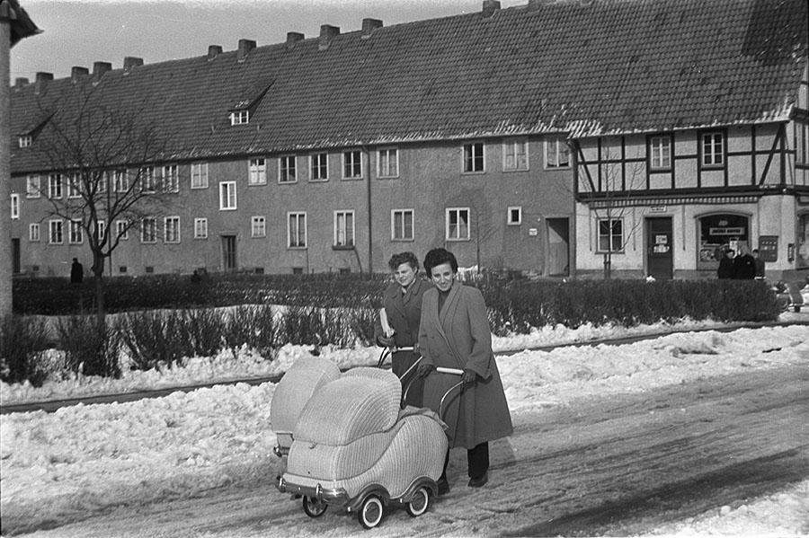 Stolz führen die jungen Frauen ihre Kinder in den eleganten 1955er Korbkinderwagen aus.