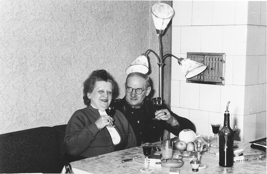 Der Eisenbahner genießt mit seiner Ehefrau ein Gläschen vor der für die Zeit typischen dreiarmig-biegsamen Tulpenstehlampe.