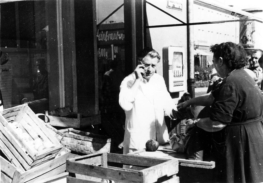 Der mit weißem Kittel gekleidete Gemüsehändler W. hatte an diesem Tag schon fast alles verkauft.