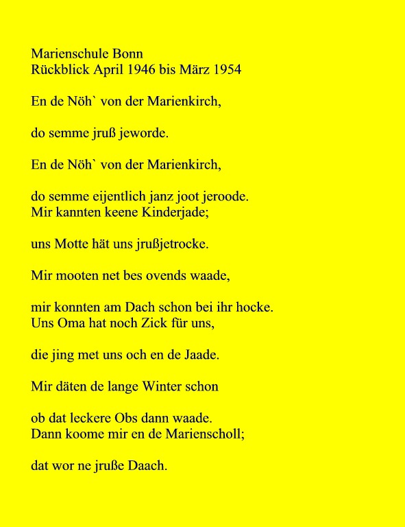 Diesen wunderbaren Rückblick auf die Schuljahre 1946 bis 1954 in Bönnsch Platt hat die ehemalige Schülerin Karola Mertens geschrieben.