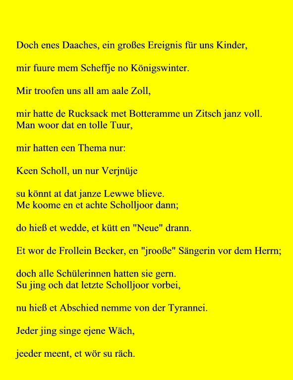 Diesen wunderbaren Rückblick auf die Schuljahre 1946 bis 1954 in Bönnsch Platt hat die ehemalige Schülerin Karola Mertens geschrieben.