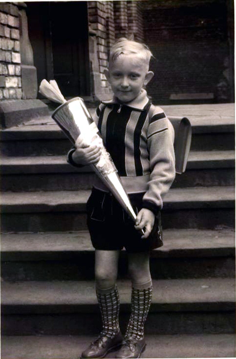 Mein Klassenkamerad Norbert B. steht hier stolz bei seiner Einschulung im Jahre 1957 vor der Eingangstreppe der Marienschule.