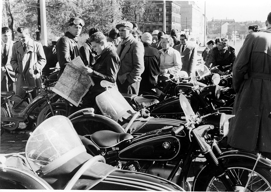 Die Teilnehmer an der ADAC-Fahrt in Fürth 1953 studieren die Fahrtstrecke auf der Karte