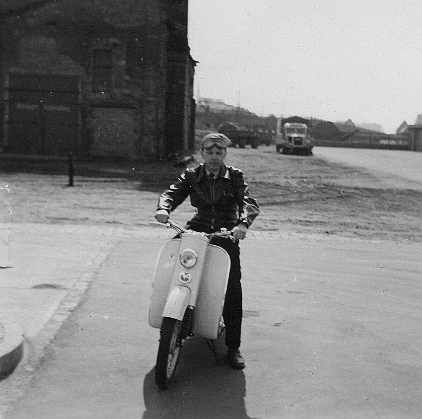 Stolz wird auch dieser Roller am 01.04.1956 präsentiert; im Hintergrund grüßt ein Lkw-Langhauber