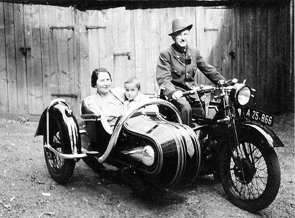 Enkel Ludwig mit Oma und Opa auf dem NSU-Gespann