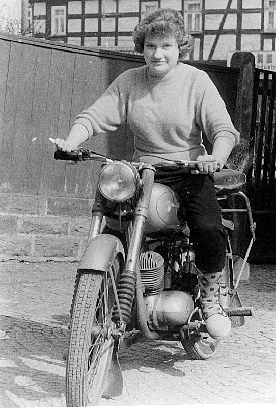 Diese junge Dame sitzt im April 1955 auf einem MZ-Motorrad