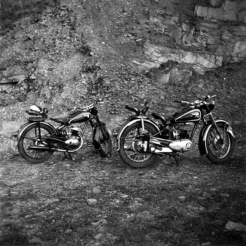 Während einer Rast im Ahrtal werden schnell die beiden schönen Motorräder der Fünfziger abgelichtet