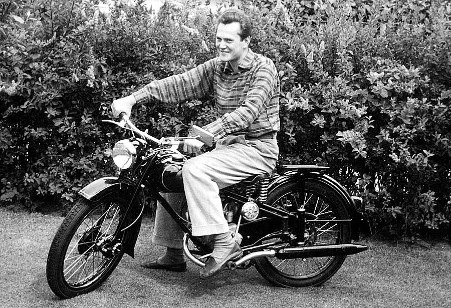 Glücklich mit dem neuen Motorrad steht dieser Herr in einem Spandauer Garten im Juli 1957