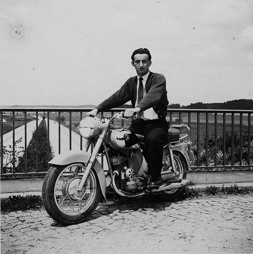 Auf einer Autobahnbrücke wird diese schöne Puch-Maschine im Bild festgehalten