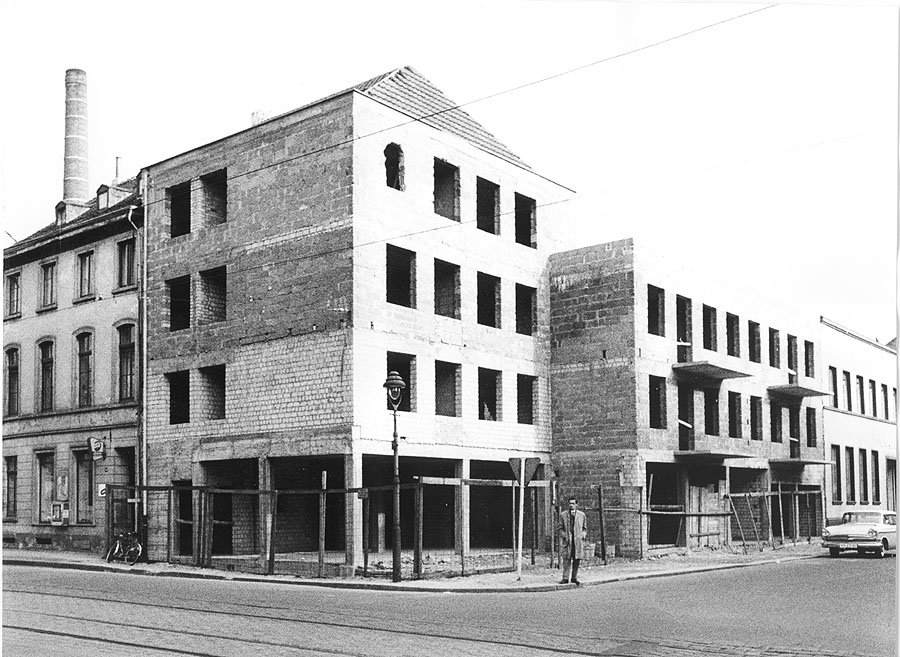 Opel Kapitän vor einem mit Reststeinen aus Ruinen errichtetem Neubau in Krefeld