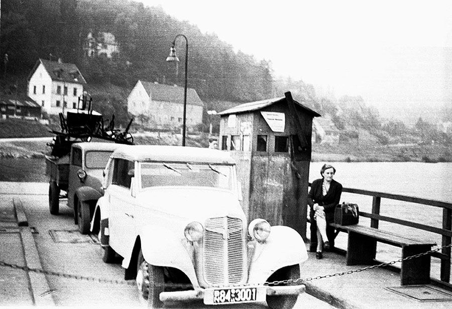 Adler Trumpf Cabrio mit einem Gutbrod Heck 504 (1946-50 / ex Standard) auf einer Flussfähre im Jahre 1950