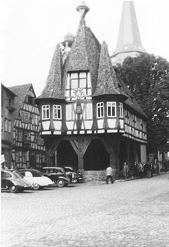 Zwei DKW parken vor dem alten Rathaus von Michelstadt im Odenwald.