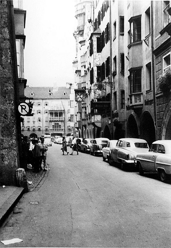 Zugeparkter Straßenzug mit Fahrzeugen vieler Automarken, beginnend mit einem Opel. Es folgt ein Studebaker Champion (1951)