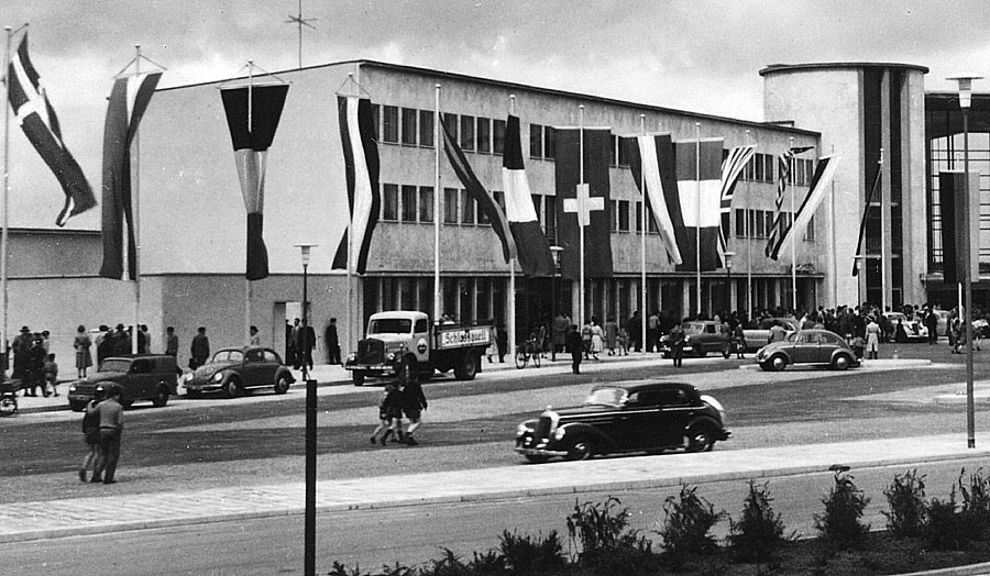 Straßenszene vor dem Heidelberger Hbf mit Mercedes Limousine, Mercedes Laster, Fiat und VW Käfer