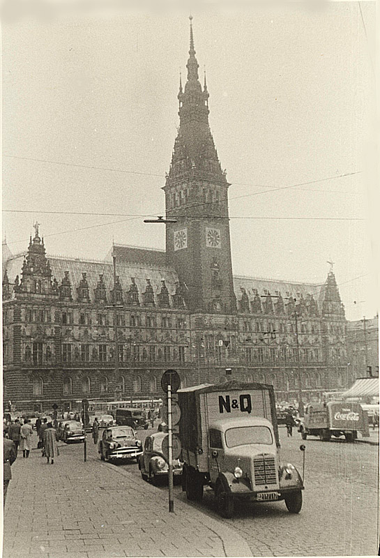 Borgward Lkw, VW Käfer und Opel Olympia Rekord, Coca Cola-Lkw im Straßenbild am Hamburger Rathausmarkt