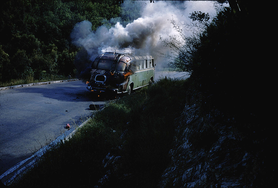 Mit dem Setra-Reisebus in fröhlicher Gesellschaft unterwegs und plötzlich stand der Motor in Flammen