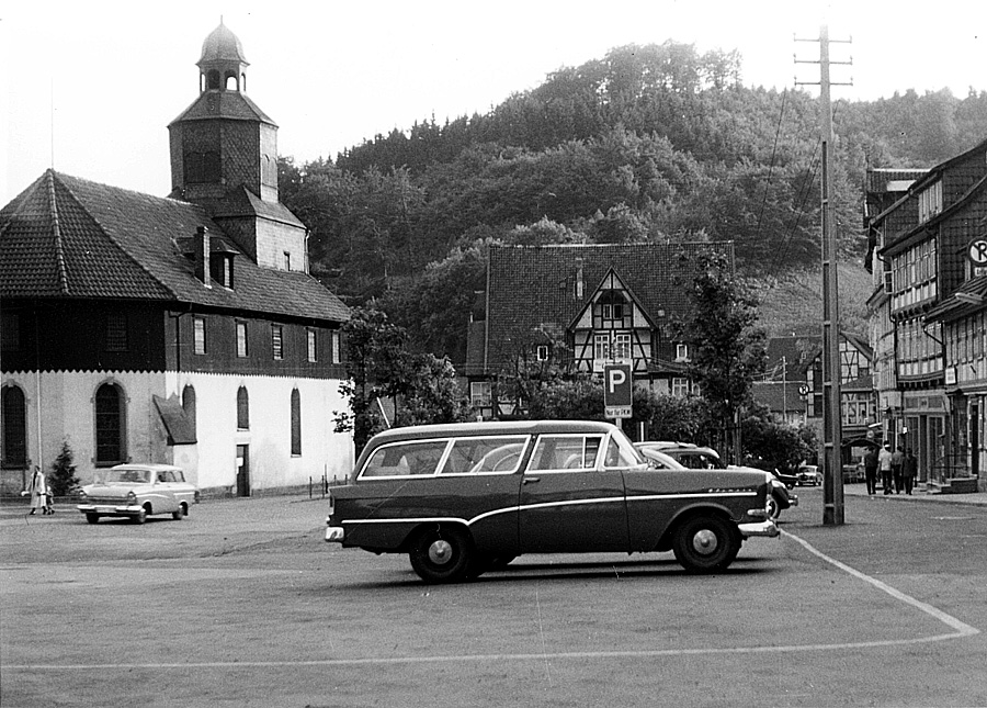 Opel Rekord Caravan (P1), im Hintergrund Ford 17m Turnier "Barocktaunus" (P2) auf einem Parkplatz