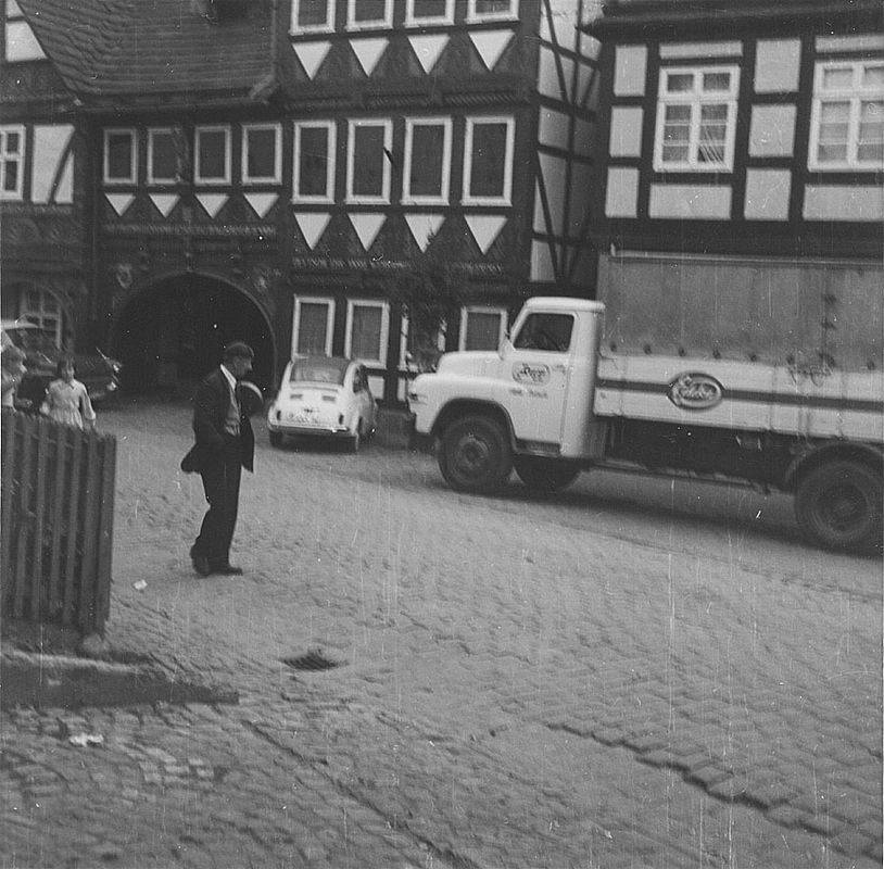 MAN-Lastwagen vor Fiat 500 in einem kleinen Ort