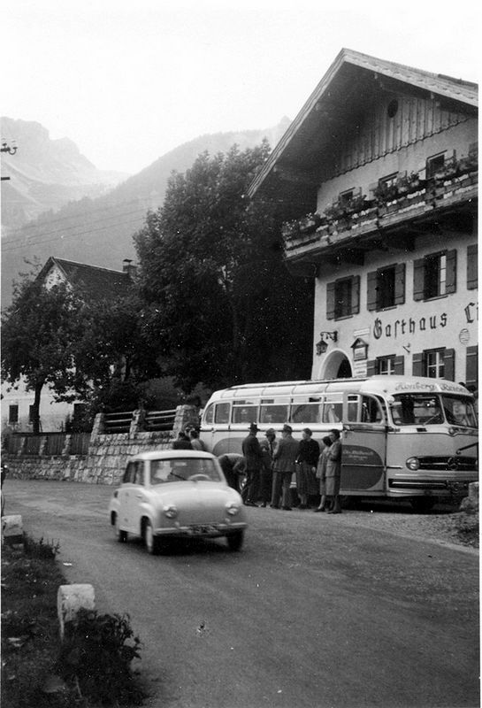 Ein Goggomobil passiert 1955 einen Mercedes Reisebus vor einem Gasthaus in den Bergen
