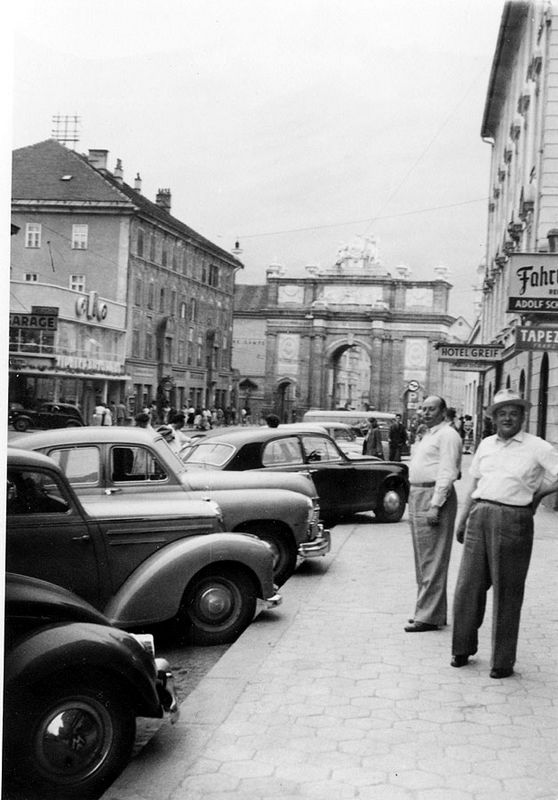 Straßenszene mit parkenden Fahrzeugen der Fünfziger