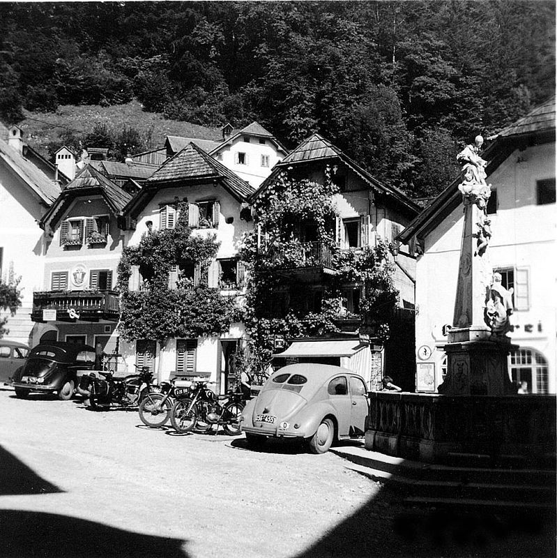 "Brezelkäfer" noch mit Zeigern, VW Käfer Cabrio und Motorrädern in Hallstatt / Österreich