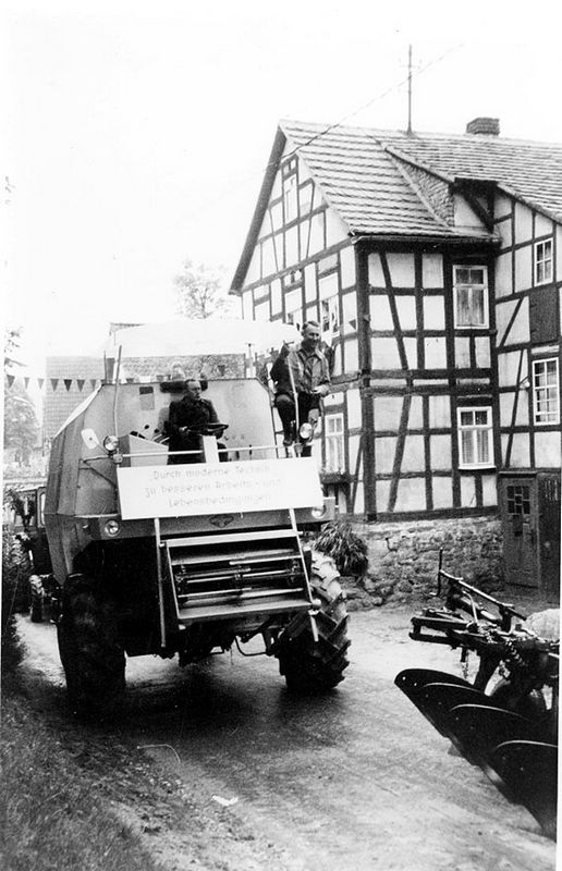 Mähdrescher in einem Umzug mit landwirtschaftlichen Fahrzeugen