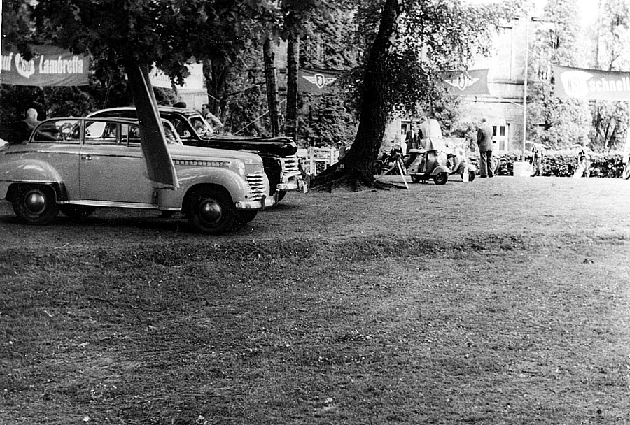 Opel Olympia und Opel Kapitän mit Lambretta Motorroller auf einer Fahrzeugausstellung