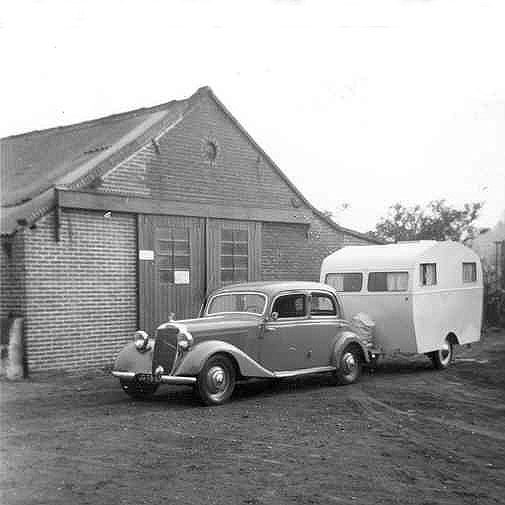 Gleich verschwindet das Gespann mit dem Mercedes 170 V Diesel und Wohnwagen wieder in der Garage.
