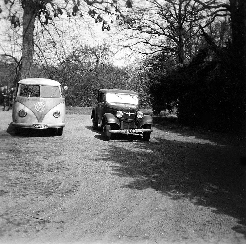 In der Besatzungszeit trifft eine Adler-Limousine auf einen VW-Transporter.