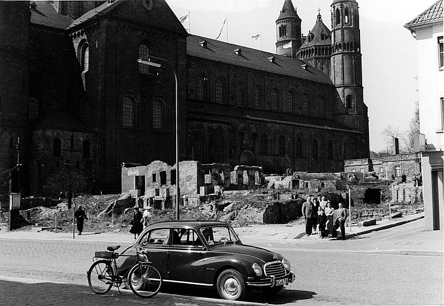Vor dem Wormser Dom hat am 13.04.1958 ein DKW - vor der im Hintergrund dazu gehörenden Familie - Aufstellung genommen.