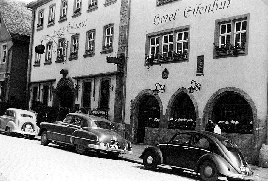 Vor dem HOTEL EISENHUT, dem Traditionshaus in der historischen Altstadt von Rothenburg ob der Tauber, stehen in den Fünfzigern