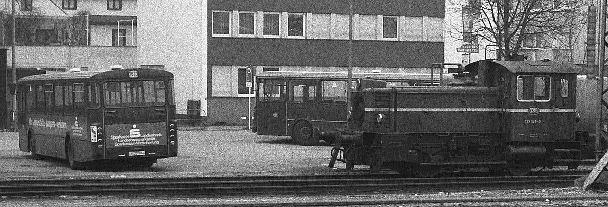 Mercedes (O 307) Bahnbusse und Lok 333 149 in Göppingen am 19.02.1984