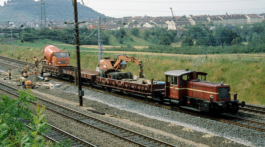 Arbeitszug mit Zuglok 332 055 und mitgeführtem Betonmischer-Lkw "Readymix" am 25.07.78 in Asperg