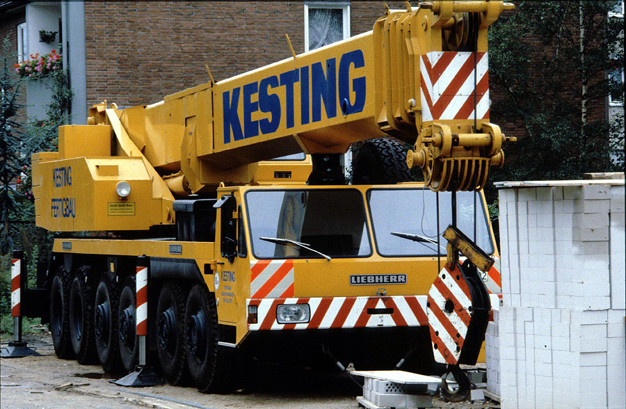 Der Kran der Fertigbau-Firma Kesting ist Mitte der Achtziger in Düsseldorf im Einsatz