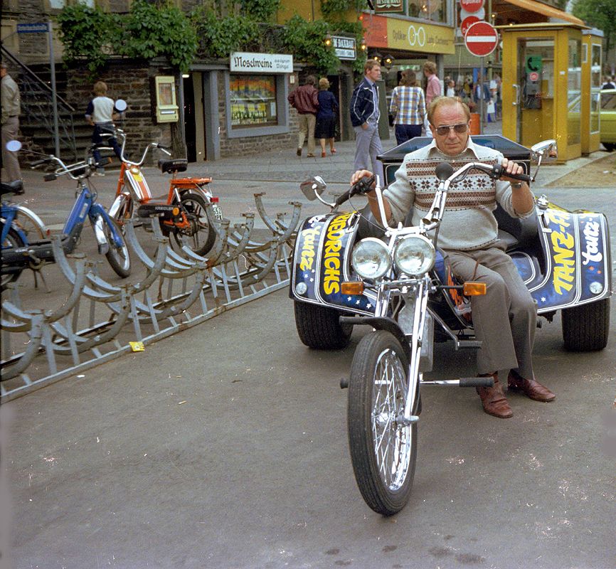 Schnell mal auf das tolle Motorrad unbekannter Marke setzen, das hier 1986 am Straßenrand steht