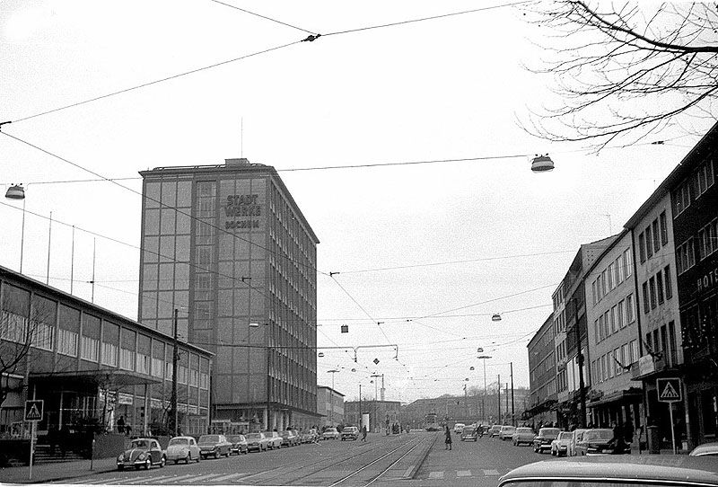 Straßenverkehr auf der Wittener Straße an der Zentrale der Stadtwerke im Bochum des Jahres 1964