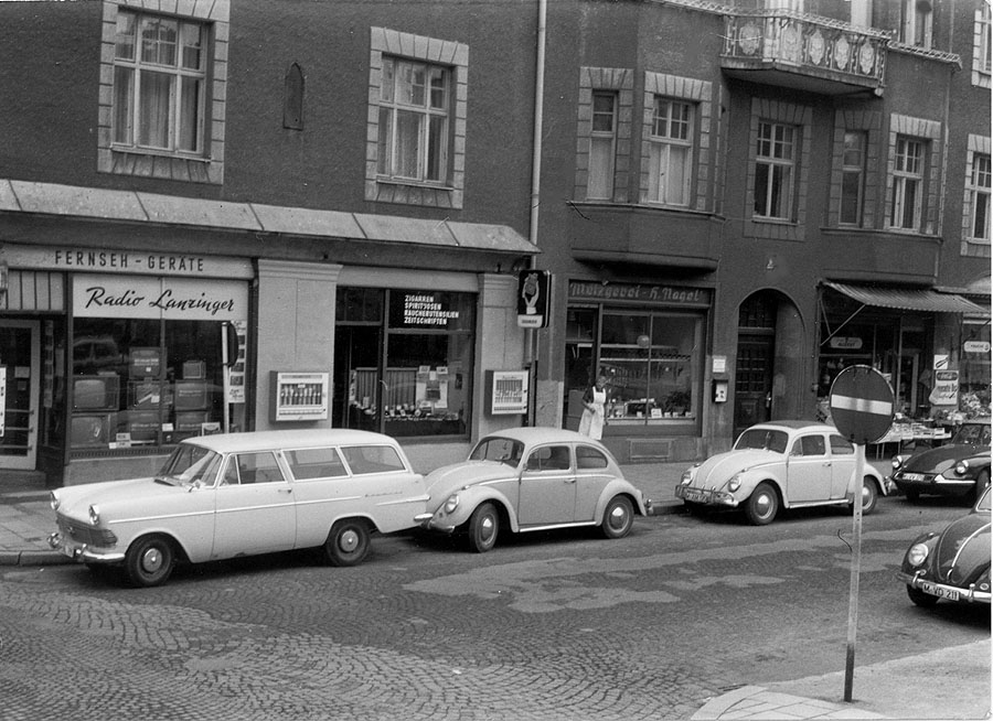 Straßenszene in München am 01.09.1967 mit Opel Rekord Kombi, VW Käfern und Citoen DS