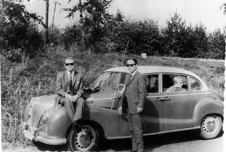 Zwei Geheimagenten (?) 1960 vor ihrem BMW der 500-Serie "Barockengel"