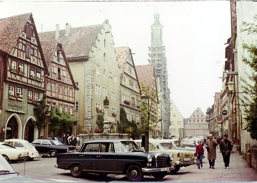Diese Straßenszene zeigt im Vordergrund eine Mercedes Benz 200 "Heckflosse", neben weiteren Opel und VW