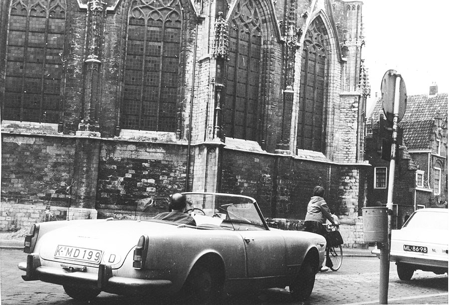 Der nächste Besuchspunkt ist diese holländische Kirche, die der Fahrer mit seinem Alfa Romeo 2000 Spider soeben erreicht hat