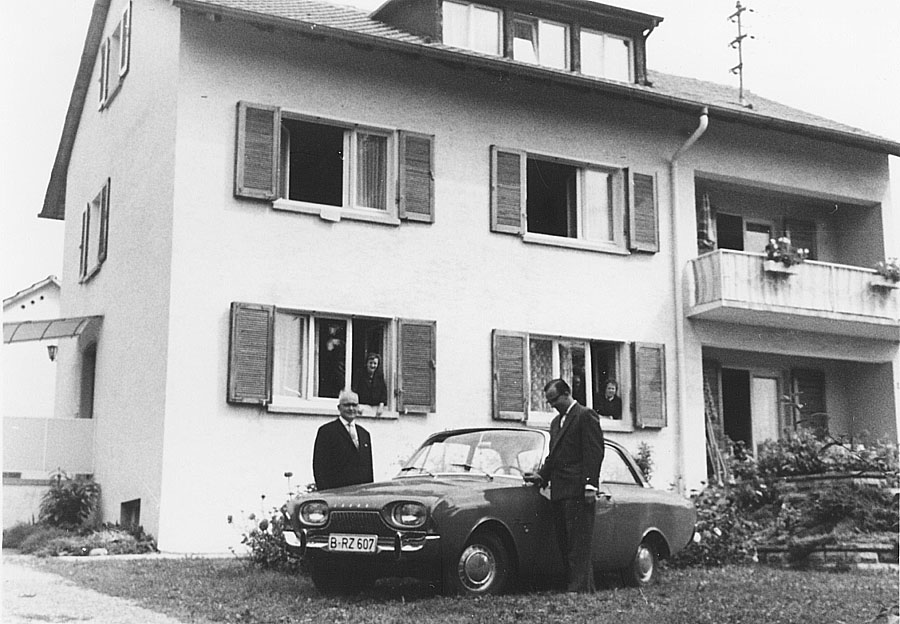 Vater und Schwiegersohn bewundern gemeinsam den schönen Ford Taunus 17m "Badewanne"