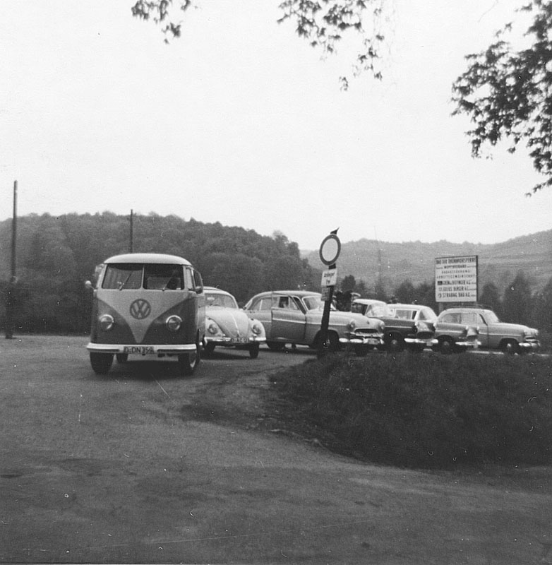 Zur Besichtigung der Baustelle "Dhünnvorsperre" sind die Besucher 1960 mit vier Opel-Pkw, einem Käfer und einem VW Bus Typ T1 angereist